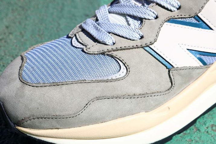 以前、本連載の第14回で紹介した「237」とノリ的には近いものがあり、ブランドが誇るアーカイブの名作モデルを組み合わせ、現代的なディテールアップ&バランスで仕上げた手腕が光ります。では、ここからは「M5740 LLG」の実物の写真をご覧いただきつつ、シューズの細部を掘り下げていきましょう。