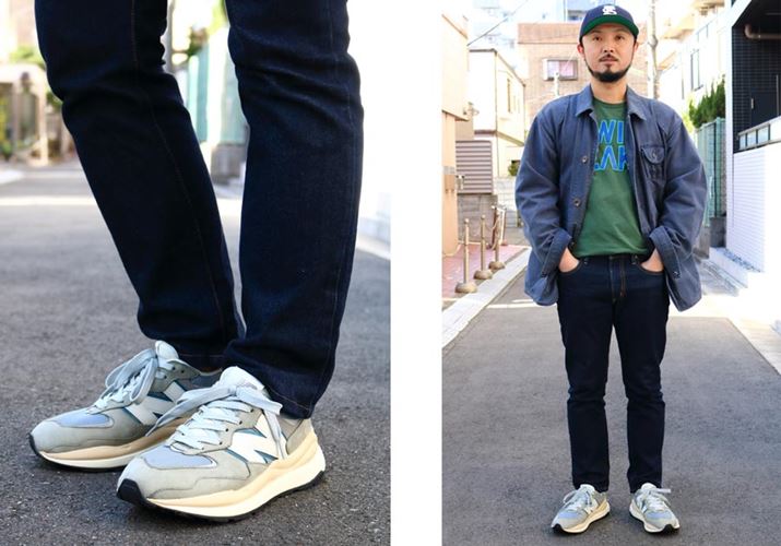 ボトムスは、かの山下達郎氏も愛用しているというエドウィンのデニムパンツ「402」。トップスは、東京・桜新町にあるショップ「シエスタ」のTシャツ。その上に、古着で購入したポロ ラルフ ローレンのハンティングジャケットを重ねてみました。さらに、キャップは、ニューエラ×フラグスタフのコラボモデル。全体としては、ネイビーを基調としたアメカジスタイルですが、そのままでは面白くないので、チョイとストリートの香りをプラス。ここに、「M5740 LLG」の「グレー/ブルー」を合わせてみると……!?