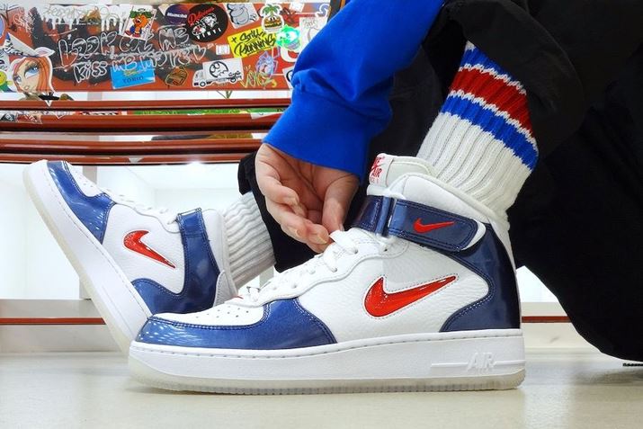 本モデルは、毎年7月4日の「独立記念日(インディペンデンスデイ)」を祝してナイキからリリースされた「ナイキ エア フォース 1 MID QS インディペンデンスデイ」の復刻モデル。アメリカ合衆国の星条旗を連想させる「ホワイト×ブルー×レッド」のトリコロールカラーがポイントで、初夏にふさわしい鮮やかなカラーリングです。また、パテントで切り替えたマッドガードやヒール、あでやかなジュエルスウッシュなど、オリジナルのディテール使いも忠実に再現しています。