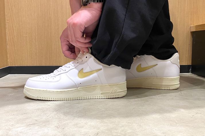そして、もうひとつ注目すべきは、ミッドソール。アッパーは、通常版の「エア フォース 1」と同様に、天然皮革から由来する、ハリとコシがあって上品な質感を誇るホワイトレザーを採用しています。いっぽうでミッドソールは、アイボリーに近い、若干黄ばんだようなカラーリングを採用。クリーンなホワイトのアッパーと、日焼けして退色したようなミッドソールとのコントラストが目を引きます!