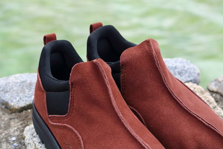 デザインとしては、センターシーム構造や丸みを帯びたシルエット、簡単に脱ぎ履きがかなうスリップオン仕様といった「ビートニック」の特徴を忠実に再現。そのうえで、アッパーには高級感のあるプレミアムスウェードとヌバックで、大人の足元に最適な品格も演出します。もちろん最大のポイントにして一目瞭然なのが、サンダル→ブーツへのアレンジ。往時の姿と人気を知る世代の目には、かなり新鮮に映りますよね。ここからは、シューズの細部にフォーカスしていきましょう。