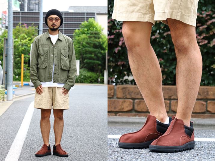 ボトムスは、パタゴニアのスタンドアップショーツ。トップスはモニタリーのミリタリージャケットを着用。ウーシングのニットタムに色付き眼鏡で、ちょいブラックカルチャーの匂いもひと挿し。正直、まだまだTシャツ&ショートパンツでも十分イケちゃう気候ですが、さすがにオーバー40なので世間体を気にして自重。で、ここに「ビートニック モック」の「ブラッシュブラウン」を合わせてみると……!?