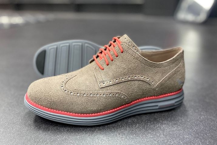 まずは本作のベースモデル「オリジナルグランドウィングオックスフォード」について紹介。最初に注目したいのが、ミッドソールです。高い衝撃吸収性能と反発力を兼ね備えたオリジナルのシューズテクノロジー「グランドフォーム」が、軽快な履き心地を提供してくれます。さらにそこに、天然のタンポポ由来のゴムを25%以上含む特許技術「FowerFoam」テクノロジーを加え、サステナブルな1足に仕上げています。