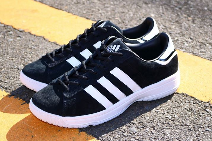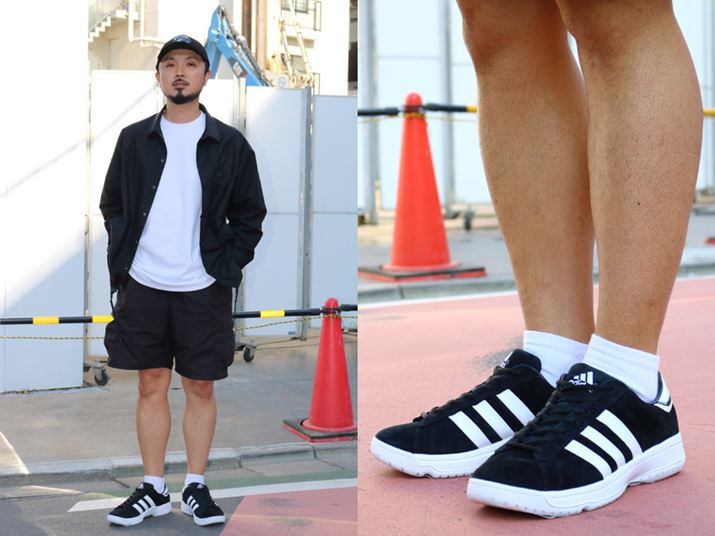 着用するのは、アディダス オリジナルスの「キャンパス シュプリーム ソール」(ブラック)