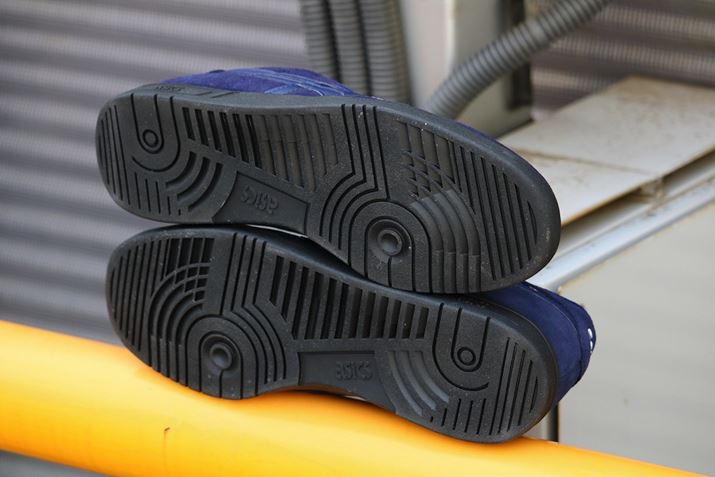 続いて、履き心地を左右するソールユニットも見ていきましょう。背面に回るとヒールタブ部には「GEL(ゲル)」の文字が描かれています。「オーリー」など、スケートデッキごとジャンプするトリックをした際に重要なのが、着地時のクッショニング。その点、アシックス独自のクッション技術「ゲル」テクノロジーを内蔵したソールは、すぐれた履き心地を提供します。また、アウトソールに刻まれたパターンもポイントです。スケートデッキの表面に貼られたグリップテープをしっかりとつかむようにデザインされています。筆者は試しに自転車に乗ってみましたが、ペダルもがっちりと噛んでくれてイイ感じでした。