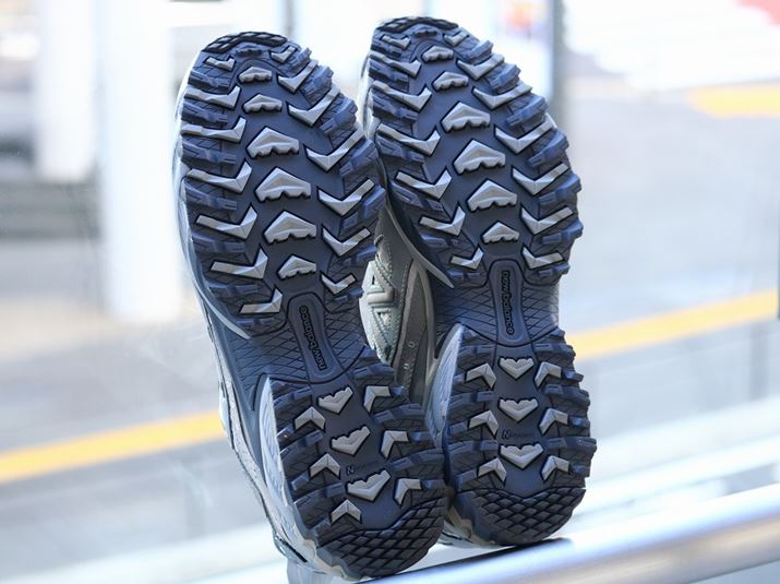 引っくり返してアウトソールもチェック! ヒール部分には、高い耐摩耗性を誇る独自のラバーコンパウンド「Ndurance(Nデュランス)」を使用。これと、不整地でもグリップ力を発揮するトレッドパターンの相乗効果で、あらゆる路面において高い接地力を発揮します。