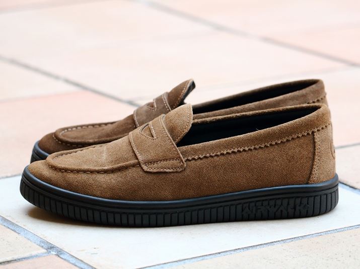 バンプ(甲)部分はモカシン縫いで、これが立体的なフォルムを成形することで、大人の顔立ちを演出。素材にはやわらかく足なじみのよいスウェードレザーを採用。その上に配されたハーフサドルは、スリットが入ったいわゆるコインローファーのそれ。1950年代のアメリカ東海岸の学生たちの間で、ここに1セント(ペニー)硬貨を挟んで履くことが流行したことに由来するディテールということで、カジュアルな雰囲気によくハマります。