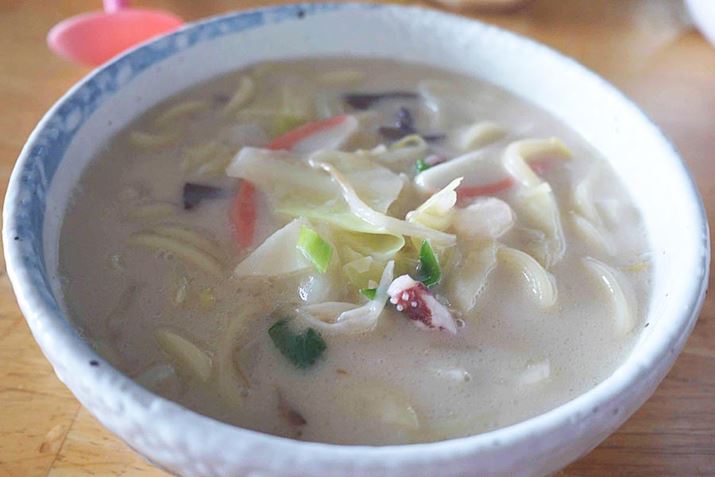 白湯スープはコクうま! 太い麺もスープに絡みます。いかやえびなどの具材もバラエティーがあっていいですね