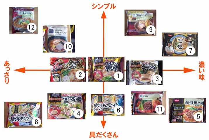 筆者のおすすめ12種類の冷凍ラーメンをご紹介してきましたが、食べたくなるものはあったでしょうか? それぞれの違いがわかりやすいよう、分布図にまとめてみました。お好みや気分に合わせて選んでみてください。