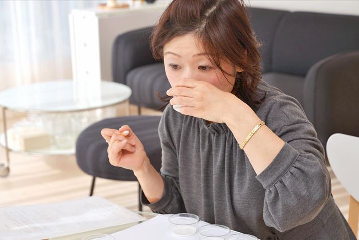吟味する小山さん。「『甘み』に関しては、舌への甘さの感じ方が商品ごとに違うから難しいですね〜」と言いながらも評価してもらいました