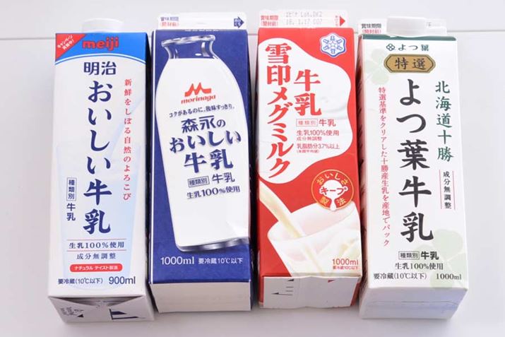 最初は定番の成分無調整牛乳、いわゆる牛乳です。今回は大手メーカーの明治、森永、雪印メグミルクの3商品と、筆者が個人的に気になっている中堅メーカー、よつ葉乳業の1商品を選びました。