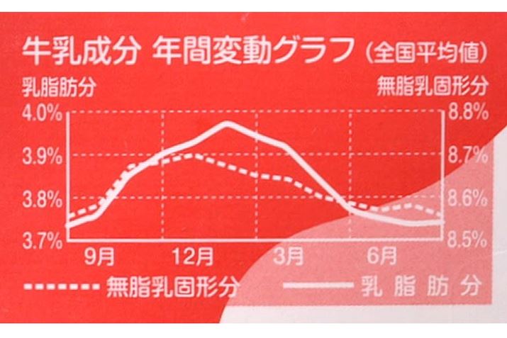 「雪印メグミルク牛乳 1000ml」の裏面に記載されていた成分の年間変動グラフ。乳脂肪分は1〜2月が1年で最も多くなるようです