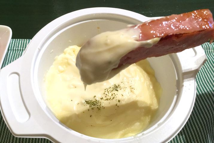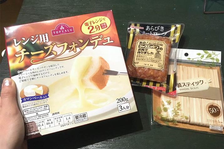 市販のチーズフォンデュ、ミートローフ、それを刺すスティック。ほかにもパンや野菜など、お好きな材料もどうぞ