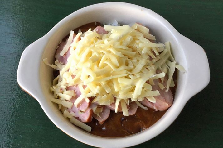 グラタン皿にごはんを入れてその上にレトルトカレーをかけます