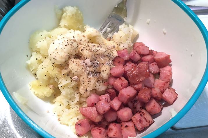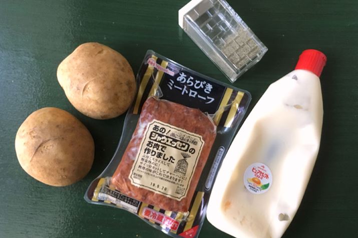 じゃがいも、ミートローフ、マヨネーズ、ブラックペッパー。後は塩こしょう、お好みで砂糖や酢、レモン汁など
