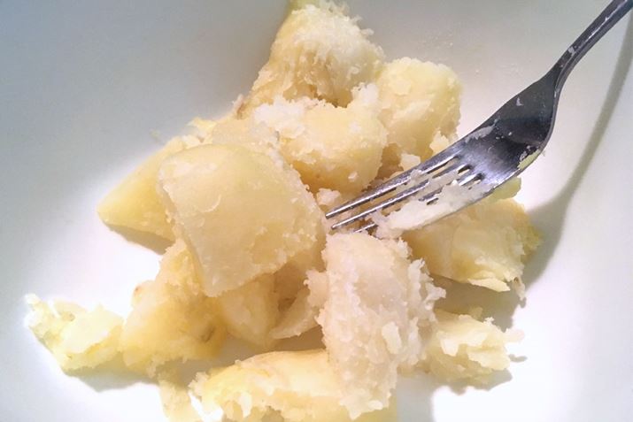 茹でる、レンジで温めるなどしてふかしたじゃがいもの皮をむき、つぶします。完全につぶさないで、いびつさがやや残るほうがおいしいです