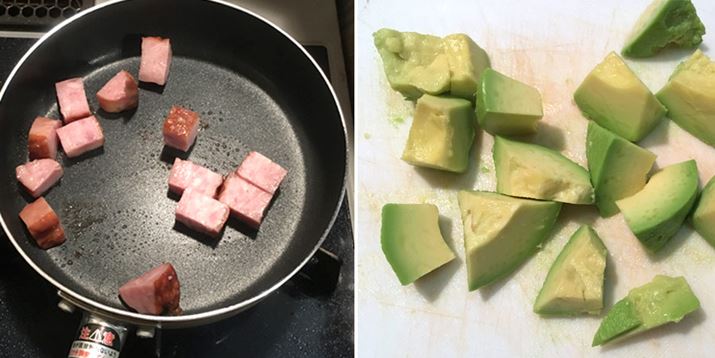 ミートローフはお好きな量をお好きな形に切り、フライパンで焼きます。アボカドもお好きな形にカット。今回は半量を使いました