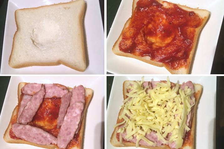 食パンの真ん中にスプーンなどで窪みを作ります。その上にケチャップもしくはピザソースを塗ります。さらにその上にお好きな形、厚さでカットしたミートローフ、シュレッドチーズをON!