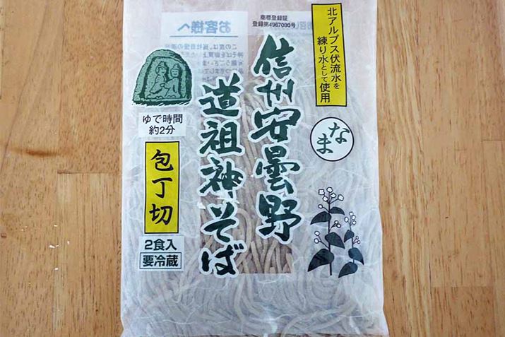 続いては「信州そば」です。そばといえば信州というくらい有名な産地ですが、地元には「長野県信州そば協同組合」というものがあり、長野県内で製造されたそば粉を40%以上配合した良質の干しそばのみを「信州そば」として認定しているのだそうです。かつては「そばがき」や「すいとん」として食べられていたものを、現在のそばの形状に包丁で切り分けたのが信州そばのルーツ。今回ご紹介する安曇野道祖神そばはこの包丁での切り口が独特になっており、つゆが絡みやすい形状になっているそうです。