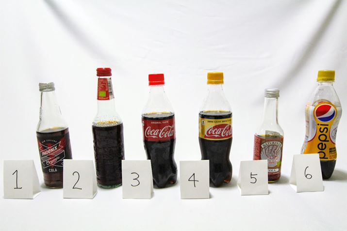 1:フェニックスオーガニックコーラ、2:ガルヴァニーナ センチュリービオ、3:コカ・コーラ(オリジナル)、4:コカ・コーラ ゼロカフェイン、5:ナチュルフリスクオーガニックコーラ アガベシロップミックス、6:ペプシスペシャル