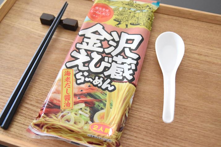 次に紹介するのが「金沢えび蔵らーめん」。こちらは「海老だし醤油」味となっています。パッケージを見ると、海老の姿も見え、濃厚な魚介系のスープが楽しめそうな予感がしてきます。