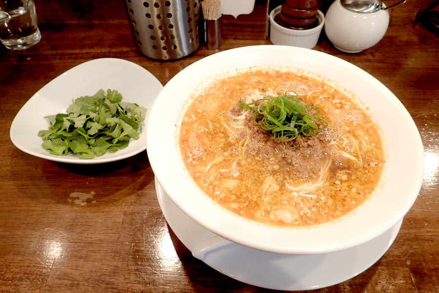 ついにやってきました、美しい輝きを放つ担担麺(850円)!さらに今回は、パクチー盛(100円)も注文。さぁ、どうなるか?