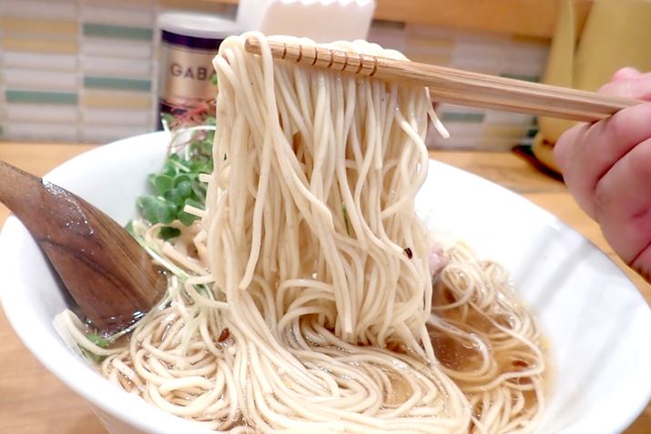 吉備黒鶏、丸鶏、香味野菜がベースという醤油スープは、やさしくて美味しく、ところどころに見える「刻みゆず」がいいアクセントになります。「暑い日差しの海岸で食べたい、さっぱりラーメン!」と直感で思いました。
