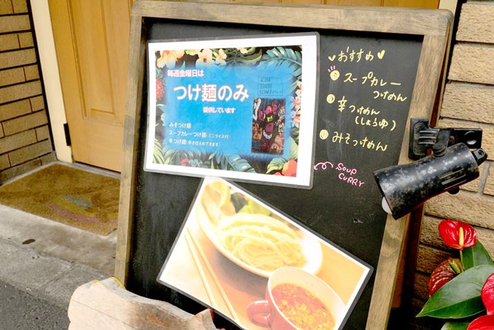 毎週金曜日はつけ麺のみの提供になるので、「醤油SOBA」を食べたいと思う方はご注意! 筆者が金曜日に行った際には、「スープカレーつけ麺」、「辛つけ麺(醤油)」、「みそつけ麺」の3つがメニューとして用意されていました