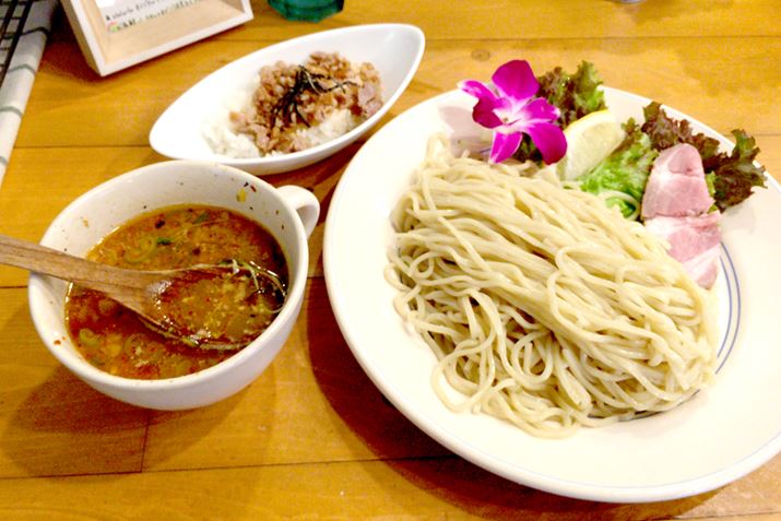 よく見ると、ハワイア〜ンな気分を演出する花がお皿に飾ってありますし、付け合せのレモンを入れると、さらに“さっぱりとした夏気分”にもなれます。醤油SOBAとつけ麺、両者を食べ比べてみると、結果的には、つけ麺のほうが“ハワイ感”が強かったかもしれません。2日連続の来訪となりましたが、災い転じて、福となしたかも。