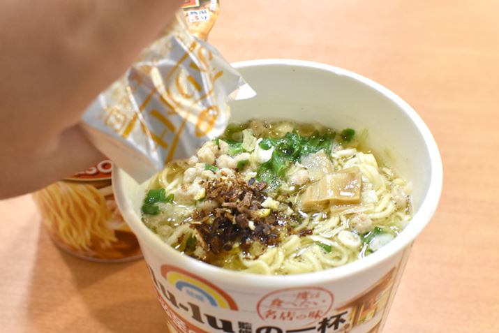 カップ麺には、タテロング型としては珍しく、液体スープとふりかけという2つの袋が別添えで付いていました。熱湯を入れて3分、これらの調味料を入れて、軽くかき混ぜるとラーメンが完成します。