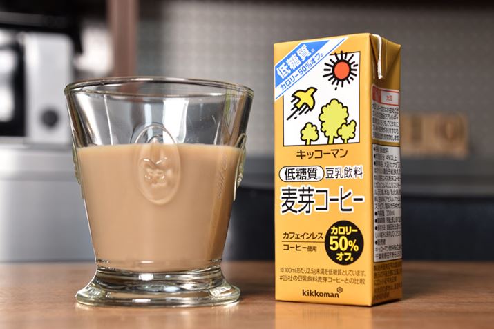 糖質2.8gでカフェインレスコーヒーを使用する。カロリーは「キッコーマン 豆乳飲料 麦芽コーヒー」の50%オフ