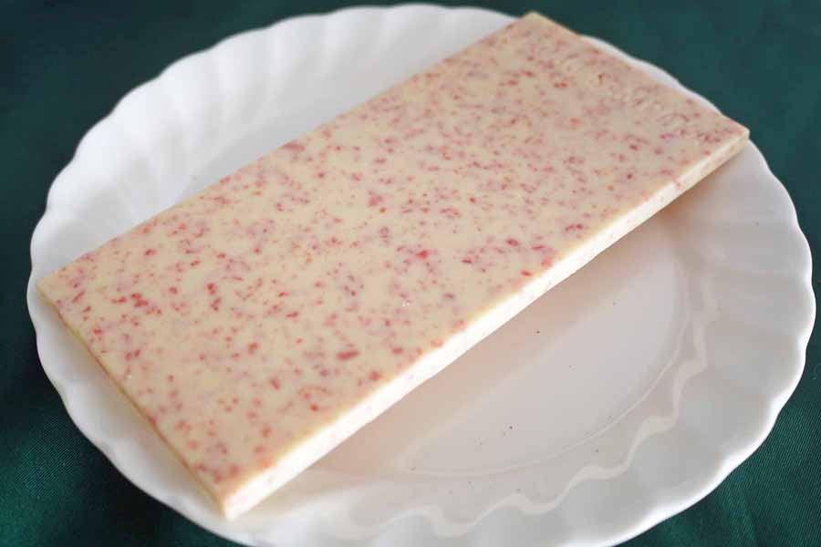 最後はスペイン王朝御用達のCACAO SAMPAKAから、バラの香りといちごのホワイトチョコレートを。ちょっとダークチョコに飽きてきましたよね。なのでそんなときはホワイトチョコですよ。見た目も華やかそしてバラの香りがほのかに香って、まさにスイーツなチョコレートです。