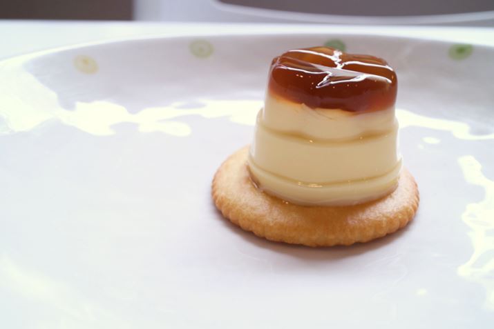 リッツにちょこんと載ったプリンがめっちゃくちゃかわいくないですか? むしろ愛(いと)おしさすら感じる。