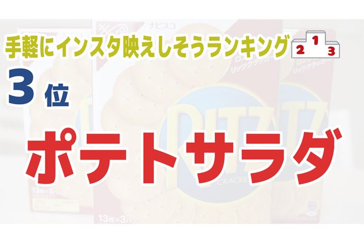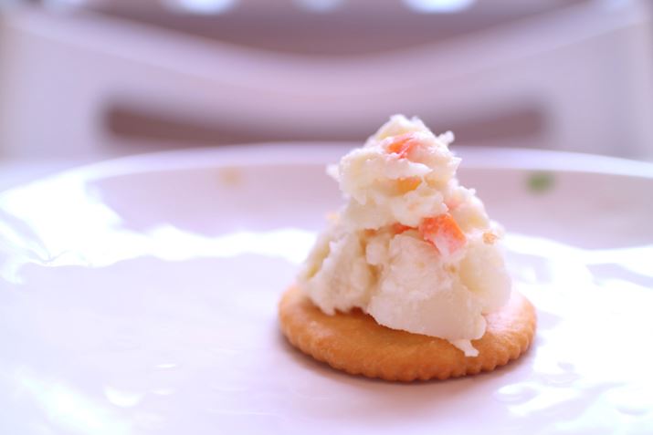 リッツに何か載せて写真を撮る場合は、ある程度の高さがあったほうが立体的に写り写真映えする。そしてポテトサラダにはにんじんやコーンが入っているものがあるので、色みもキレイ。