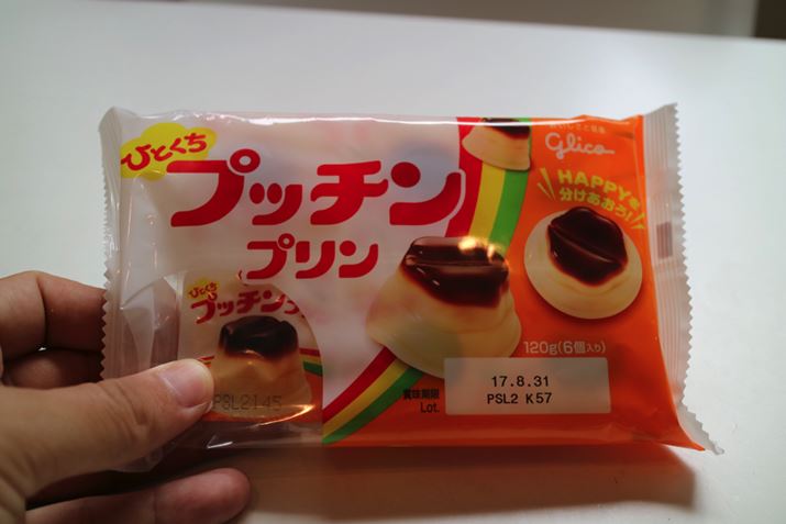 一口プリンというのは、例えばこのグリコの「ひとくちプッチンプリン」のように、一口ゼリーみたいな形をした小さなプリンです。これがリッツにちょうどいい大きさなんですよ。