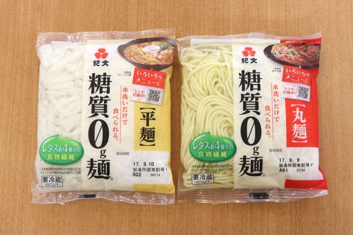 うどん風の「平麺」(左)と、中華麺やパスタ代わりに使える「丸麺」(右)があります。価格はともに160円ほど。スーパーやコンビニにも並んでいるので、かなり手に入れやすいはず。ほかにも、通販限定の常温保存タイプ(平麺)や、調味料付きタイプもラインアップされています