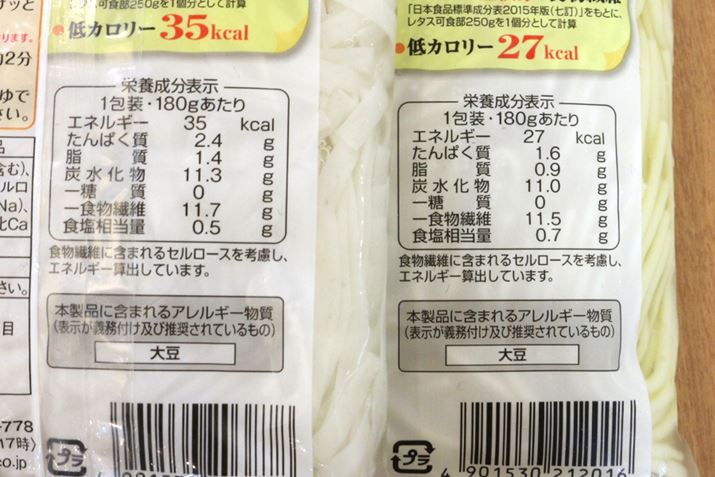 「糖質0g麺」の主原料は、おからパウダー、こんにゃく粉、海藻由来のアルギン酸ナトリウム(おそらくつなぎの役割)。その名のとおり1食180g中の糖質は0gで、カロリーは30 kcal前後(平麺35 kcal、丸麺27 kcal)です。同じ180gでも、普通の麺に含まれる糖質とカロリーは、中華麺は糖質約50g、カロリー270kcal、生パスタは糖質約80g、カロリー約440kcal、うどんは糖質約40g、カロリー約190kcalと言われているので、1食置き換えるだけで糖質とカロリーを大幅にカット可能。しかも茹でる必要はなく、水洗いするだけで食べられます。