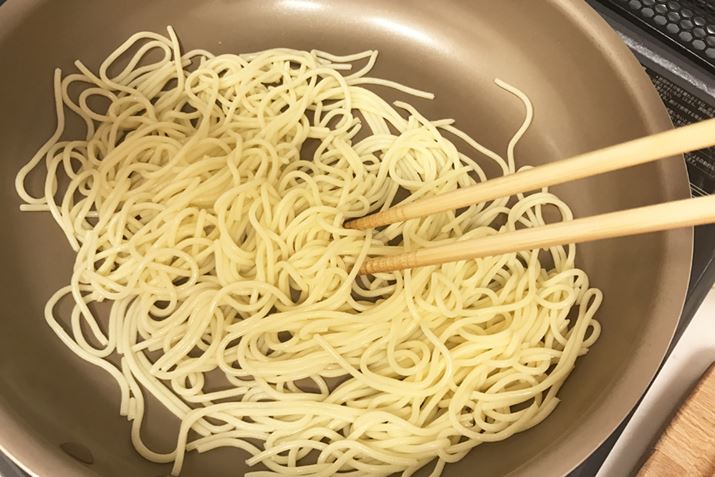炒め系レシピの場合は、フライパンで4分ほど麺を乾煎りをして水分を飛ばす必要があります。手間がかかるので、汁物に比べて分が悪い