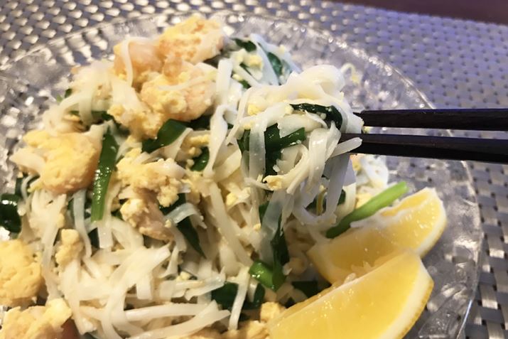 見た目がそっくりなパッタイ(タイ風焼きそば)風に。パッタイ特有の弾力はもちろん皆無ですが、野菜の歯ごたえがあるのでそこまで気にならず、いけます。