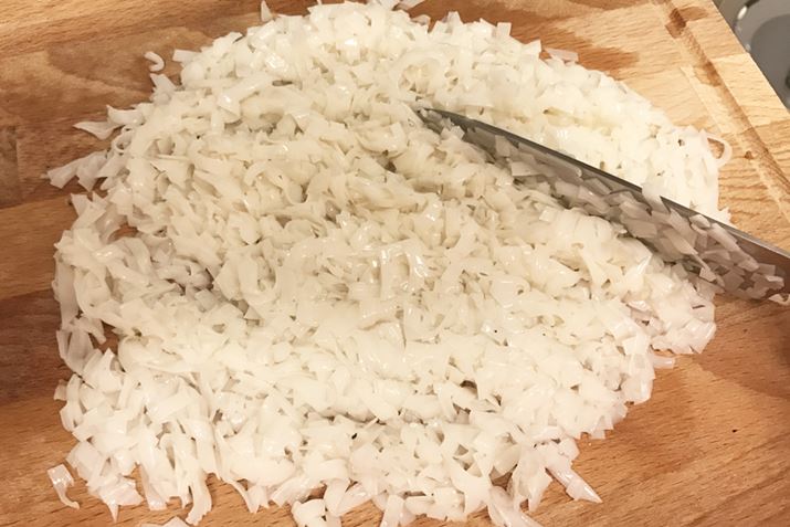 刻んだ平麺をごはんに見立ててチャーハン風にします。麺を刻むのはめんどうですが、豆腐で代用ごはんを作る場合は20分ほど乾煎りする必要があるので、それに比べればずっと楽です。できあがりは期待以上で、パラッとしてておいしい!