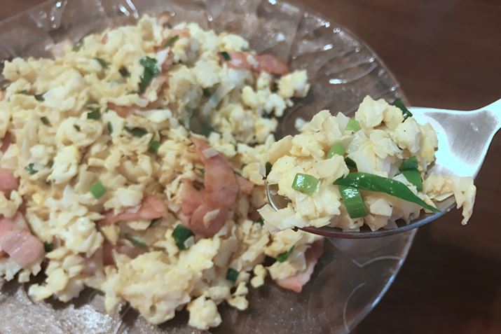 パラパラに仕上がり、かなり本物のチャーハンに近い味。ただ、かみ進めるうちに舌触りがぬるっとしてきます。かみ過ぎずに飲み込むのが、よりチャーハンぽく味わうコツでしょうか
