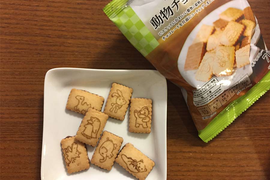 左から時計回りに、動物チョコビスケット、ラシュクーレ(チョココーティングのラスク)、マシュマロです
