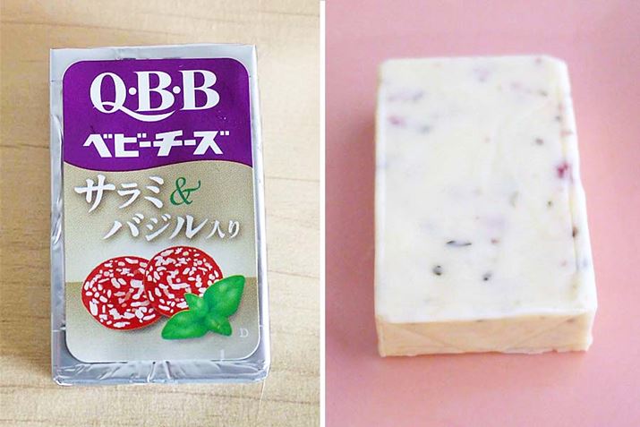 これまた大人の味わいのベビーチーズです。思った以上にサラミ感があり、バジルの香りと風合いがさらにサラミを引き立てています。バジルの風味がかなり効いているのですが、後味はサラミなんですよね。まるでオードブルを食べたような気になるリッチさです。