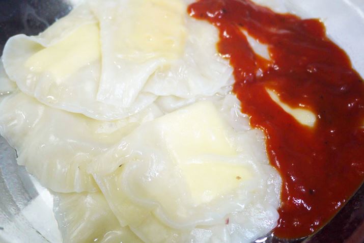 餃子の皮を使ってチーズを巻いてお湯でゆでるだけで、簡易ラビオリのできあがり。トマトソースをかけて食べると最高です