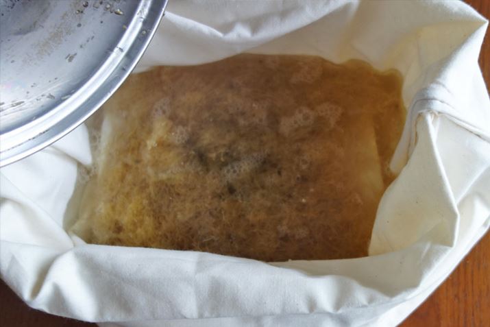 こし布を使ってしっかりこします。1回ズボラを発揮してキッチンペーパーで代用しようとしたら、見事に失敗しましたのでご報告しておきますね