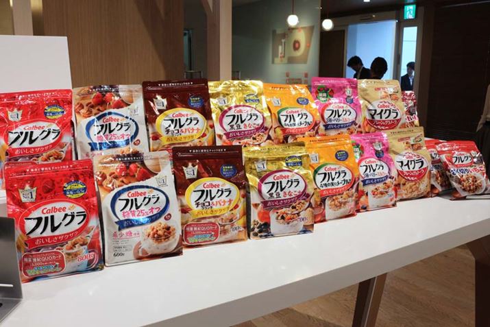 「フルグラ」はグラノーラのみでフルーツなどが含まれないプレーン味の「マイグラ」、「糖質25%オフ」などの9種類(期間限定商品を含む)をラインアップ