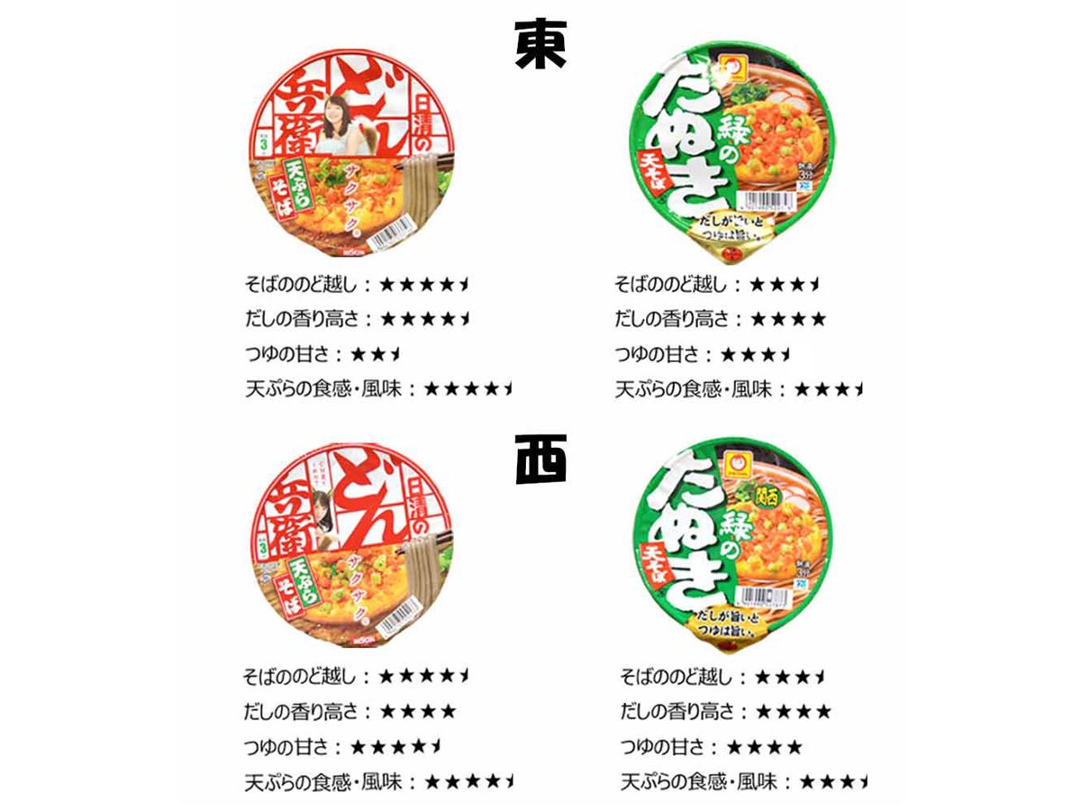 「つゆの甘みは『どん兵衛・西』と『緑のたぬき 天そば(東向け)』の間に入ります。ただ、煮干しが入っているせいか、東より甘みが柔らかな印象ですね。あと天ぷらを食べ比べた感じ、サクサク感に関しては『どん兵衛』のほうが好きです。なお全体の味に関してはそれほど違いを感じませんが、『どん兵衛』の天ぷらのほうが、若干油っこいかもしれないですね」(平島さん)
