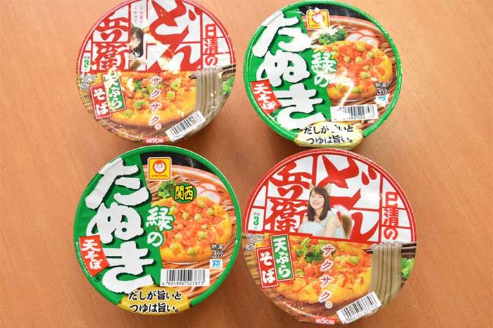 おなじみの「どん兵衛(日清)」と「緑のたぬき(マルちゃん)」。それぞれ東日本向けと西日本向けの2種類ずつを集めました