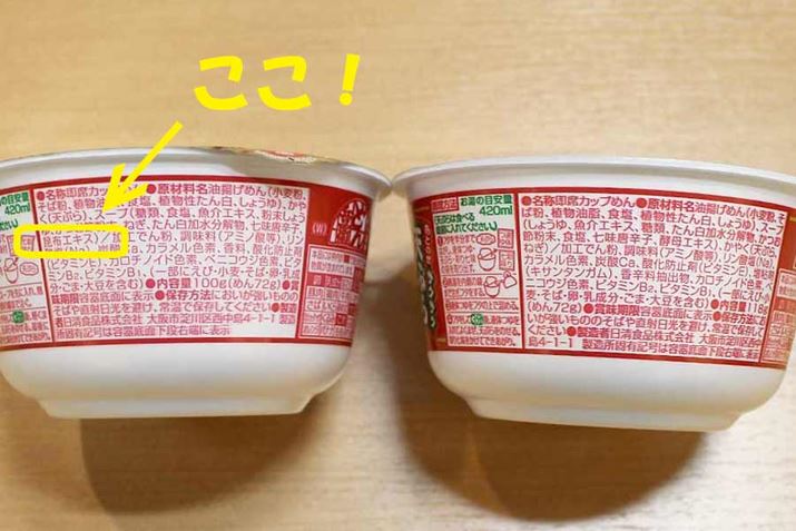 どちらも「どん兵衛」で、左が関西、右が関東。原材料の部分を比較すると、基本的な材料はほぼ同じ。しかし関西のほうには「昆布エキス」の文字が! ちなみに成分表記は、関東のほうが3kcal高く、脂質は0.6g、炭水化物は0.1g高いものの、食塩相当量は0.3g低いそうです