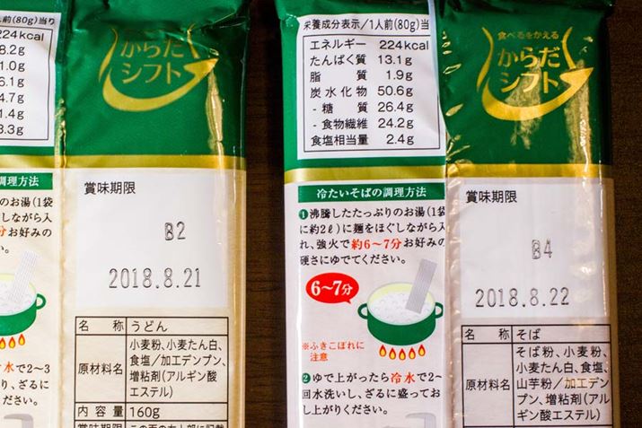 パッケージ裏の原材料名を見てみると、「糖質コントロール そば」の原材料は、そば粉、小麦粉、小麦たん白、食塩、山芋粉/加工デンプン、増粘剤(アルギン酸エステル)。「糖質コントロール うどん」の原材料は、小麦粉、小麦たん白、食塩/加工デンプン、増粘剤(アルギン酸エステル)。そばもうどんも小麦粉より70〜80%糖質オフとなる小麦たん白(グルテン)を使用している。増粘剤として表示されているアルギン酸エステルは食物繊維なので、この2つから糖質オフが実現できているとわかる。